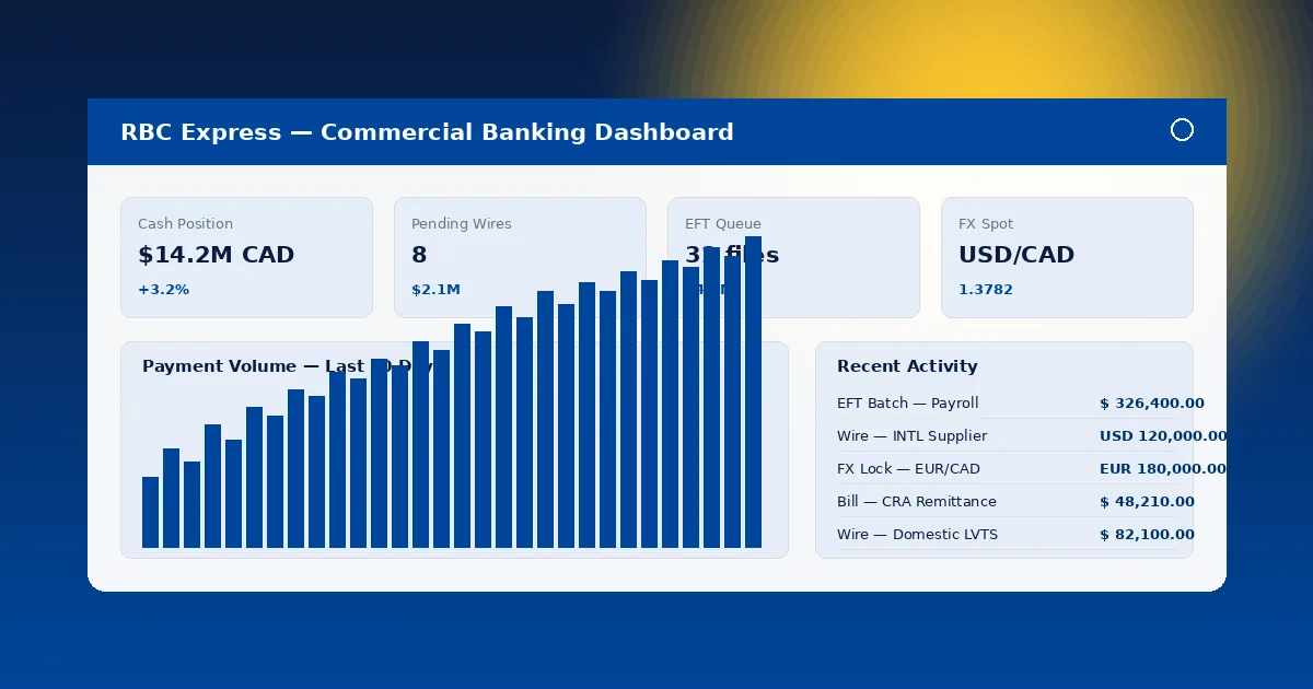 For recurring supplier payments, RBC Express EFT batch origination handles Payments Canada AFT-formatted files with same-day and next-day settlement. According to Payments Canada data, EFT volume exceeded 9.8 billion items in 2024 — RBC Express handles a meaningful share.